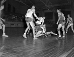 Image shows a basketball game between Ash Crescent and Topsy's Cafe. Jimmy Tingle (8) moves in on unidentified Topsey's Cafe player covering loose ball in title game at Recreation Building. Ash Crescent players are Reid Mclamore, sitting, Knobby Graves (6) and Moe Worthington (7). Topsy's won, 80-39.
