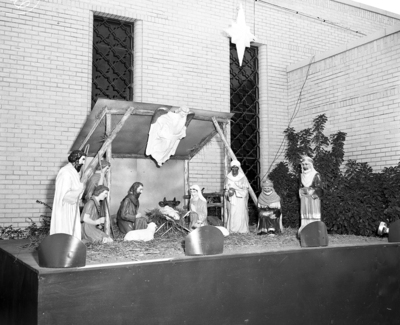 The nativity theme is predominant in outdoor Christmas decorations this year. The scene on the back lawn of the Thomas A. McCann home at 2815 Simondale as viewed from Alton Road.