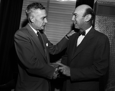 Judge Allen B. Hannay of Houston, right, president of the Texas Elks State Association, is greeted by A. M. Reese, exalted ruler of the Fort Worth Elks Lodge, at the lodge's meeting.