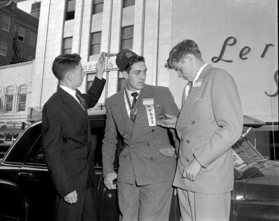 Regalia of DeMolay member George Rains, 5417 Hampshire Boulevard, center, won approval from Guy Sullaway, left, and Don Grace, right, both of Wichita Falls.