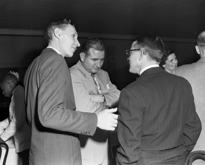 Image shows Clyde DeVoll, Jack Scott and Clyde Millican in conversation at the Circulation Department party.