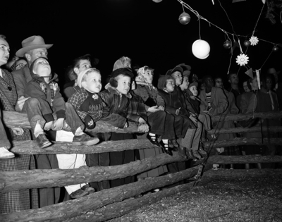Seated on the rustic fence for a closeup of the glittering tree Wednesday night at the Star-Telegram Christmas Tree and Music Festival in Burk Burnett Memorial Park were, left to right, David Ronald Clark, 4, of 2736 Meaders; David Ball, 4, and Gene Harold Ball, 8, OF 5101 South Brook; Lynn Ball, 8, of 1409 Greenbair; Lorena Fae Bliss, 5, of the E. Vickery address; Kenneth Stubblefield, 3, of 604 Humphries, and Harley Elbert Haynes, 4, of route 1, Arlington.