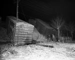 Force of a plunging, derailed freight car snapped this power pole at the intersection of E. Dashwood and the Santa Fe tracks, but the pole held a freakish grip on the top of the car- and the power stayed on.