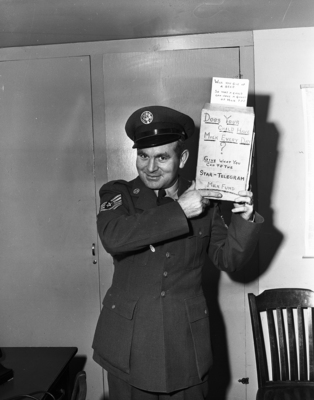 Technician Sergeant Edward E. Parson holds up a box that says "Does your child have milk every day?" Airmen of the 7th and 11th Maintenance Squadrons of Carswell Air Force Base decided to send milk to needy children. The idea was started by Tech Sgt. Edward E. Parson and Master Sgt. Harry Condell. Sgt. Parson would empty the boxes on to the Star-Telegram Mile and Ice desk and return the box to the base for more.
