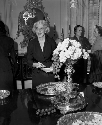 Mrs. Gaylord Chizum, president of the Junior League Garden Club, shown at the tea table. The club had a Christmas flower show and tea at the home of Mrs. C. A. Lupton, 4600 Broad. Published in the Fort Worth Star-Telegram, December 16, 1951.