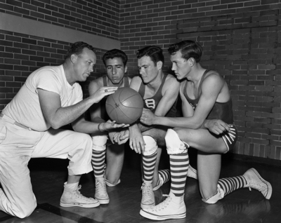 Image shows (left to right) Coach Roy Johnson, Raymond Martinez, Don Sifford and Jerry Sims talk Tech High School's basketball game strategy. Published in Fort Worth Star-Telegram evening December 27 1951.