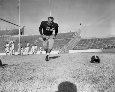 Wayne Martin, a junior from Shamrock, has stymied many a Texas Christian University football foe from his defensive end position this season and hopes to do the same New Year's Day against Kentucky in the Cotton Bowl. Published in Fort Worth Star-Telegram evening edition December 21, 1951.