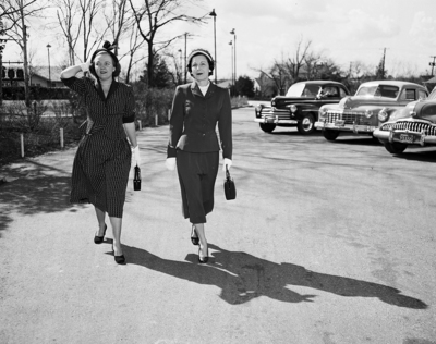Wind-tossed, as they approached River Crest Country Club, were Mrs. Maurine Lydick, wife of Mr. Joseph Willis "Joe" Lydick, 4617 Crestline, left, and Mrs. Grace Cantey, wife of Sam B. Cantey II, 908 Alta Drive, going to brunch.