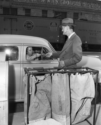 To speed handling of Christmas mail at the main post office's curb courtesy box here, officials have posted a clerk on the sidewalk to sort letters as soon as motorists hand them over. Miss Pauline Rippy at 1659 Westmoreland is shown here passing a letter to Clerk Lee P. Adkins, 2116 Crestview Drive.
