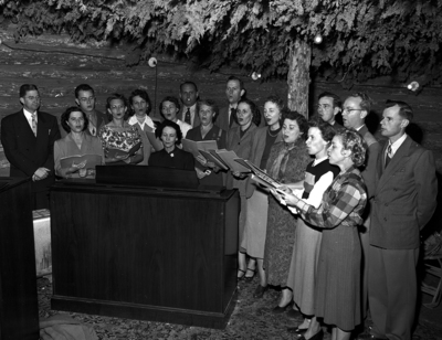 Hymns for the Yuletide and carols were sung in Carol Cabin at the Star-Telegram Christmas Tree and Music Festival by the Ridglea Presbyterian Church choir. Left to right, Reverend Clifford Williams, pastor; Mrs. H. F. Petit, Reid Bunger, Mrs. Fred Bradt, Mrs. Edwin Saltry, Miss Gladys Burnett, organists and choir director (playing the Hammond organ); Mrs. Melvin Hare, Lyle E. Rottler, Mrs. Lewis Johnson, Harvey Boyd, Miss Mary Catherine Cowan, Mrs. K. R. Molyneaux, Mrs. Paul G. Gillespie, Mrs. William J. Graff, Norman Beard, Mrs. J. H. Scott, Paul G. Gillespie and Tom E. Nunn.