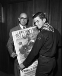 O. P. Leonard, president of the Boy Scout Longhorn Council, receives the 1952 official scout calendar from Eagle Scout Jerry Williams, 16, member of explorer Post 11. Jerry, son of Mr. and Mrs. J. M. Williams, will represent the council in state ceremonies at Austin.