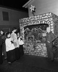 This nativity scene at St. Alice Catholic Church was blessed by Reverend Joseph M. Thomas, CYO moderator. From left to right are Mike Murphy, altar boy; Father Thomas, and Jimmy Fowler, altar boy. At extreme right is Fred Diefenbach, who designed and built and scene.