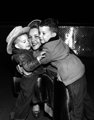Margaret Phelan, top-flight, singing star, gets a hug from a pair of her most ardent admirers-her nephews, David, left, and Eddie, sons of Mr. and Mrs. O. E. Reeder of 507 Popplewell-on her arrival here for a visit with her parents, Mr. and Mrs. Art Phelan of 3417 Denton Highway.