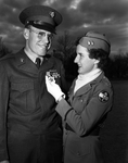 Paula Bean, Pascal High School Reserve Officer Training Corps Battalion sponsors, admires the Silver Star pinned on Master Sergeant Charles J. Alsup in a special ceremony at the school.
