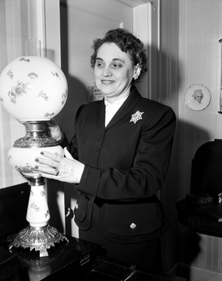 Mrs. I. A. Stephen, president of the Pierian Study Club, is shown admiring a lamp.