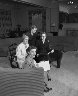 Image shows Miss Kitty Wingo, right, president of Texas Christian University (TCU), Women Ex-Students Association, and Mrs. Paul Vinsant, foreground; Mrs. E. T. Cornelius, center, and Miss Georgia Fletcher, standing.