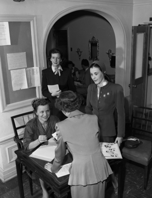 Mrs. Thurman Morgan, seated, booth chairman for the homecoming, with Miss Mary Charlotte Faris, standing, back and Mrs. Virginia Strother, standing right, make out a name tag for Mrs. Paul A. Vinsant.