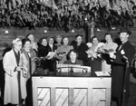 Members of the Euterpean Club chorus braved freezing weather to sing in Carol Cabin at the Star-Telegram Christmas Tree and Music Festival. William Hargrave, director, is at right, and Mrs. E. T. Cornelius is accompanist. The others, left to right, are Mmes. L. R. Elliot, Jack H. Owens, R. E. Collier, Victor Ginn, A. E. Soniat, J. G. Reeves, F. G. Thompson, Earl Moore, Paul E. Lobe and J. Herman Thomas.