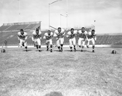 This is that "light-weight" Texas Christian University offensive line which Kentucky will face in the Cotton Bowl. Left to right are End Teddy Vaught, 185; Tackle Marshall Harris, 200; Guard Alton Taylor, 180; Center Carlton McCormack, 245; Guard Jack Ramsay, 190; Tackle Norman Hughes, 200, and End Bob Blair, 190. Published in Fort Worth Star-Telegram morning edition December 30, 1951.