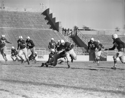 Willie Goza, Anson back, scampers for a four-yard gain against Arlington High School during a football game at Amon Carter Stadium. In background is Wayne Connell (#43), Anson center. Published in Fort Worth Star-Telegram morning edition December 16, 1951.