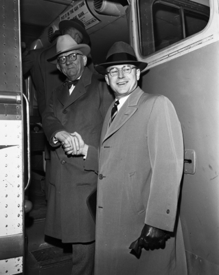 Series on meeting of Oil executives from throughout the country at the Athens farm of Ben C. Belt, Houston, vice president of the Gulf Oil Corporation for get-together at which the utilization of a major portion of the Goldsmith pool of Ector County was announced. The productive acreage involved in the unit totals 14,038 acres with 52.7 percent of the 1,053 wells in the pool included. S. A. Swensrud, Pittsburgh, Gulf president, boards the bus at Fort Worth for a trip to Athens. Published in the Fort Worth Star-Telegram, December 17, 1951.