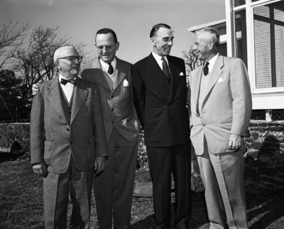 Series on meeting of Oil executives from throughout the country at the Athens farm of Ben C. Belt, Houston, vice president of the Gulf Oil Corporation for get-together at which the utilization of a major portion of the Goldsmith pool of Ector County was announced. The productive acreage involved in the unit totals 14,038 acres with 52.7 percent of the 1,053 wells in the pool included. Left to right, F. J. Adams, Fort Worth vice president, Gulf; Hoyt Sherman, president, Mene Grande Oil Company, Caracas Venezuela; Phil Bohart, Tulsa, vice president, Gulf; and J. H. Russell, Houston, vice president, Gulf. Published in the Fort Worth Star-Telegram, December 17, 1951.