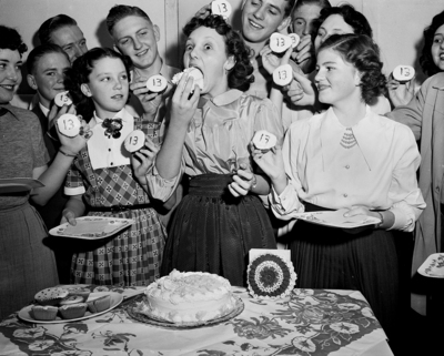 Thirteen-year-old Norita Sweaney tries her birthday cake while friends look on. She celebrated her 13th birthday and recovery from cancer at a party at her home. Her well-wishers were (clockwise) Brenda Funchess, Joe Whaley, Spanky Jones, Ben Smith, Wanda Sue Sweaney and Charlotte Odom.