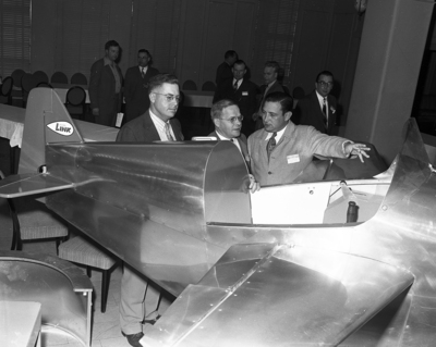 V. H. Wheatley, Brownfield wheat farmers, left; Arnold Nicholson, managing editor of the Country Gentleman, and Tex Anderson, Medina rancher, shown looking over a Link trainer on display as the National Agricultural Aviation Converence opened. Published in Fort Worth Star-Telegram evening edition March 7, 1950.