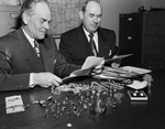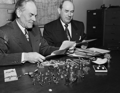 U. S. Marshal J. R. Wright, left, and his chief deputy L. N. McKelvey, opened sealed bids and sold for $4150 a collection of inexpensive jewelry accumulated in the office since the 1930s. It was first sale of its kind and high bidder was L. B. Howell. jewelry was stolen property never identified by owners.