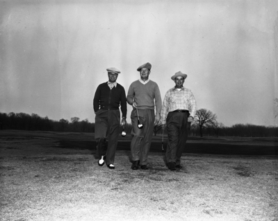 Flanked on either side by two amateur partners during a pro-amateur golf tournament at the Colonel, is pro-golfer Byron Nelson. At the left is Willard White, and on the right is Leo McClung. Published in the morning edition, December 18, 1951.