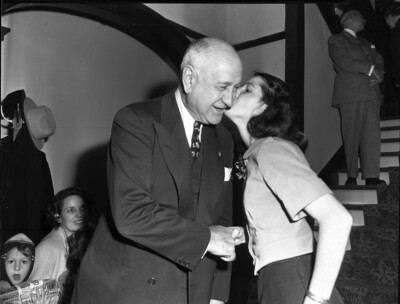 Amon Carter receiving thanks for the new quarters he has provided for the Cerebral Palsy Treatment Center at 1308 Hemphill. 12-year-old Linda Bryant, making the presentation.