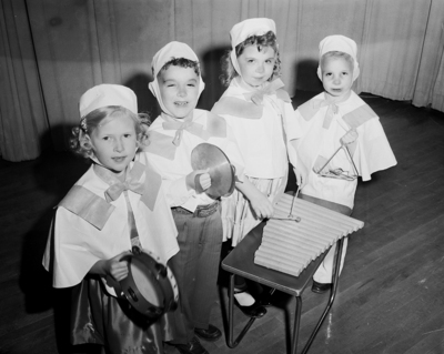 Among the children to participate in a Rhythm Orchestra program at R. Vickery Elementary School will be left to right, Carrol Simmons, Hugh Stowe, Carolyn Rickard and James King. Image shows four children in matching uniforms with musical instruments. Published in Star-Telegram evening edition March 8, 1950.