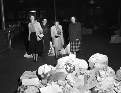 The Goodfellow bags soon reach a too weighty stage to be carried by the volunteers who now are packing them at Pioneer Palace. Mmes. F. W. Frank, W. H. Melbern, Luther Swager and D. A. Thompson pull the bags to the stack that will be ready for Christmas delivery to needy children.
