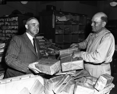 Two Arlington retired rural, mail carriers, Clark Brower, left, and W. I. Willis, right, are back on the job during the Christmas rush at the Arlington Post Office. They are working free of charge.