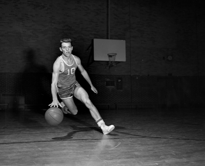 Bill Estill is one of three high scorers on Poly High basketball team which clashes with Carter. Both teams are undefeated in the city. Estill has scored 137 points in 17 games. He's a senior. He is shown in action. Published in Fort Worth Star-Telegram morning edition, December 19, 1951.