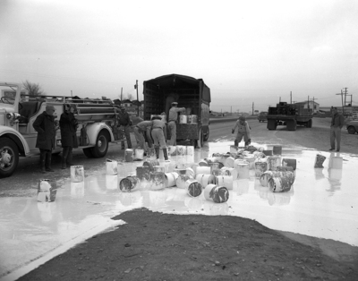 A Central Forwarding, Incorporated, tractor-trailer lost part of its cargo at 28th and Jacksboro Highway-131 five-gallon cans of the 500-can load of white paint toppled to the pavement. Workmen are pictured cleaning up the mess. A fire department truck, left, turned hoses on the paint and city street workers spread sand on the roadway.