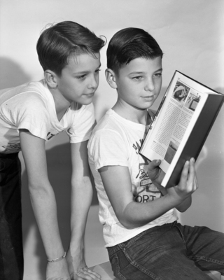 Sets of Britannica Junior and Encyclopedia Britannica World Atlases were given by the publishing firm, through the Star-Telegram, to Fort Worth children's homes and schools. Image shows Panther Boys Club members, Bobby Phipps, 9, left, and Albert Woods, 1, with a volume.