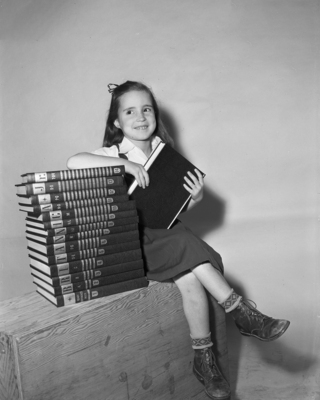 Sets of Britannica Junior and Encyclopedia Britannica World Atlases were given by the publishing firm, through the Star-Telegram, to Fort Worth children's homes and schools. Image shows Patricia Cushing, 7, of St. Teresa's Home with a set of volumes.