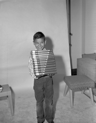 Sets of Britannica Junior and Encyclopedia Britannica World Atlases were given by the publishing firm, through the Star-Telegram, to Fort Worth children's homes and schools. Image shows Eloy Sepulveda, 8, of Wesley Community Center carries a stack of the books.