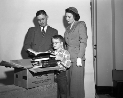 Encyclopedia Britannica, Inc., distributed free, through the Star-Telegram, sets of its Britannica Junior and Britannica World Atlas to various Fort Worth orphanages and children's institutions. Star-Telegram City Circulation Manager Fain Reynolds is shown presenting a set to Mrs. Elizabeth Ford, speech therapist, and Billy Clawson, 9, son of Sergeant and Mrs. Charles Clawson, 5108 Penrod Ct.