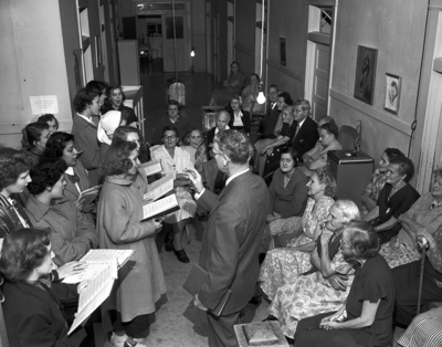 With Bernard Lunt, center, member of St. Vincent DePaul Society of St. Alice Catholic Church leading the way, Our Lady of Victory Academy's choral group bring gift of young voices to residents of the Tarrant County Home for the Aged night.