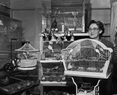 Pictured here is Miss Ruby Robinson, shown with her collection of birds in different size of cages.