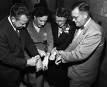 Four 25-year veterans of the Fort Worth National Bank take time out from the bank's Christmas party to set their new watches. They are, left to right, Clarence W. Garrard, Miss Mattie Lou Clinton, Miss Halcie Hovenkamp and Clarence J. Guffey.