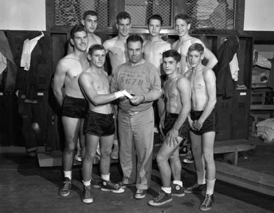 Coach E. L. Varley (center) tapes Frank Dumas' hand as eight Diamond Hill fighters begin training for the regional Gloes meet at Will Rogers Memorial Coliseum. Left to right, front row, are Wesley McDonald, Dumas, Varley, Barney Massey and Orville Means. Back row, George Lane, Jimmy Fawks, Rayburn Moyers and Bobby Means. Published in Fort Worth Star-Telegram evening edition December 20, 1951.