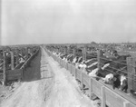Cattle in Aledo, Texas, feed lots line up at troughs.