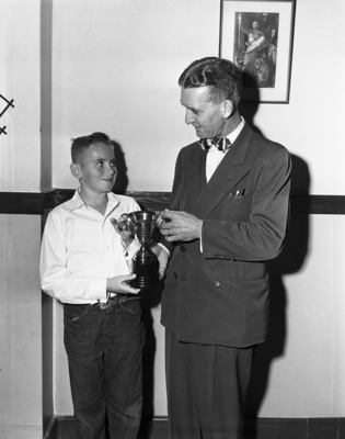 Chat Pierce Jr., son of Mr. and Mrs. Chat Pierce of 1410 E. Davis, accepts a gold loving cup won by Carroll Peak Elementary School in a safety contest co-sponsored by Fort Worth Safety Council and Downtown Lions Club. Irby Crawford, Lions safety chairman, presents the award.