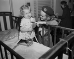 Patricia Ann Dollins, 10, daughter of Mr. and Mrs. Victor F. Maddox of 3321 Purington, was one of the Girl Scout Santas who visited children at City-County Hospital. She gave a stocking to Alva Dale Vinson, 2, daughter of Mrs. Marie Vinson of Route 7, Box 102, who was recovering from surgery on her leg.