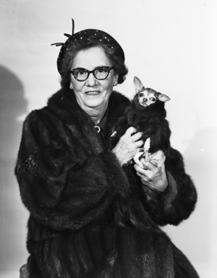 "Judy" Meade's constant companion, Rosita, three-year-old Chihuahua, gets around these days. One of Rosita's admirers sent her a baby muskrat fur coat for Christmas - just like Mrs. Meade's. Rosita hasn't missed a day going to work at WBAP, where Judy is receptionist, in 2 1/2 years. She always greets Mary Parker's Playtime audience. The coat is from Koslows.