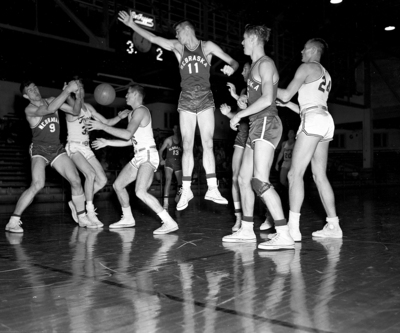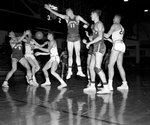 Groping, reaching and hoping for elusive basket ball at Dallas are, left to right, Nebraska's Charles Ott, Frogs' George,McLeod and Ted Reynolds and Nebraska's Don Weber, who overseas it all. Frogs won, 58-57. Published in Fort Worth Star-Telegram evening edition, December 21, 1951.