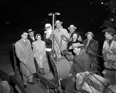 Christmas 1951 Community Tree. Tommy Vandergriff, Arlington, Kitty Ruth Bryce, Arlington, R.D. Evans, Santa(Sam Shurtleff of Lampasas, Amon Carter, Parker Wilson, Mrs. Jim Standefer of Clifton, Mrs. Aileen Houston, John Carothers, and Billy Groves of San Angelo, shown with reindeer.